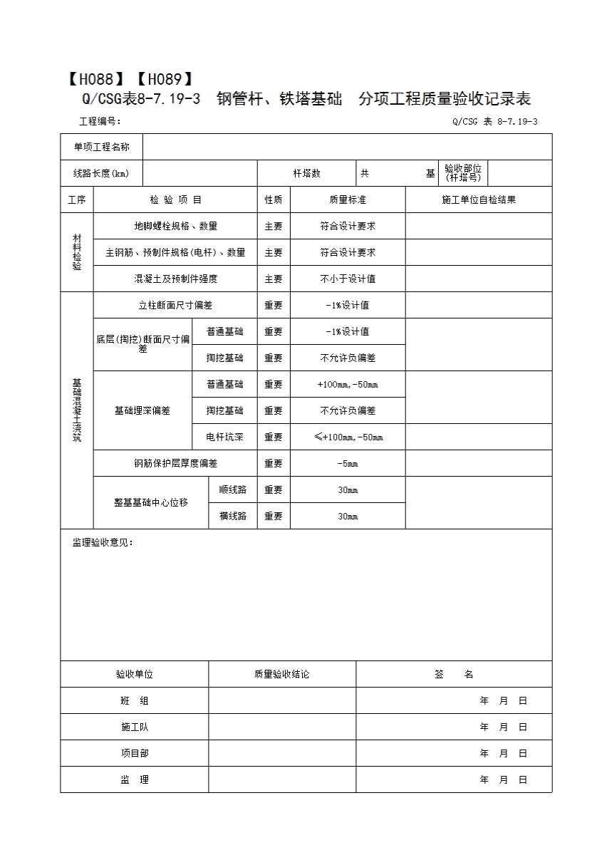 表格名称:QCSG表8-7.19-3 钢管杆、铁塔基础 分项工程质量验收记录表
