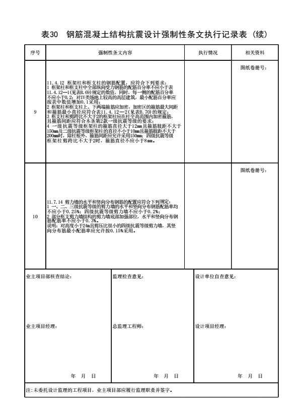 表格名称:表30 钢筋混凝土结构抗震设计强制性条文执行记录表