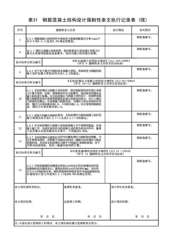 表31 钢筋混凝土结构设计强制性条文执行记录表