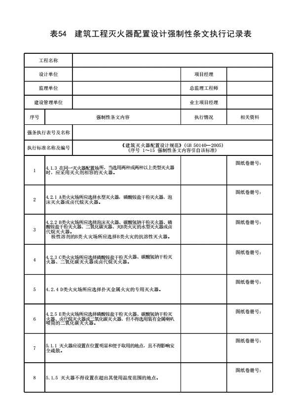 表54 建筑工程灭火器配置设计强制性条文执行记录表