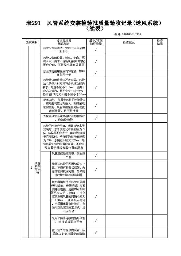 表格名称:010106010301 风管系统安装检验批质量验收记录(送风系统)