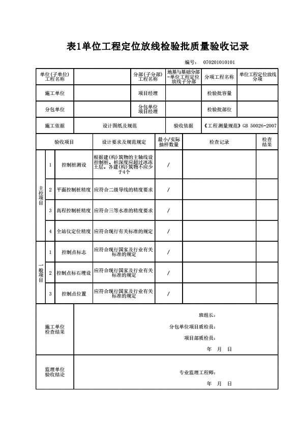 表格名称:070201010101 单位工程定位放线检验批质量验收记录