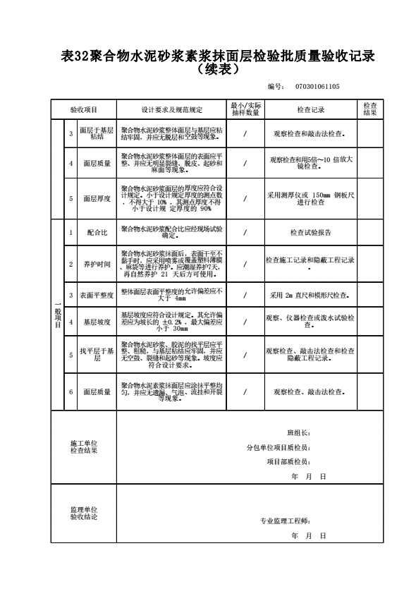 表格名称:070301061105 聚合物水泥砂浆素浆抹面层检验批质量验收记录