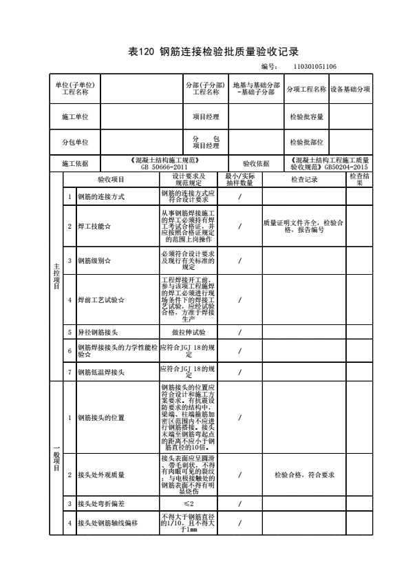 表格名称:110301051106 钢筋连接检验批质量验收记录