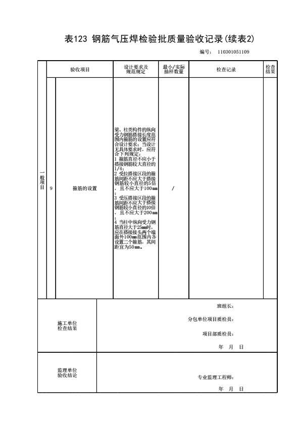 表格名称:110301051109 钢筋气压焊检验批质量验收记录