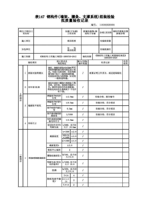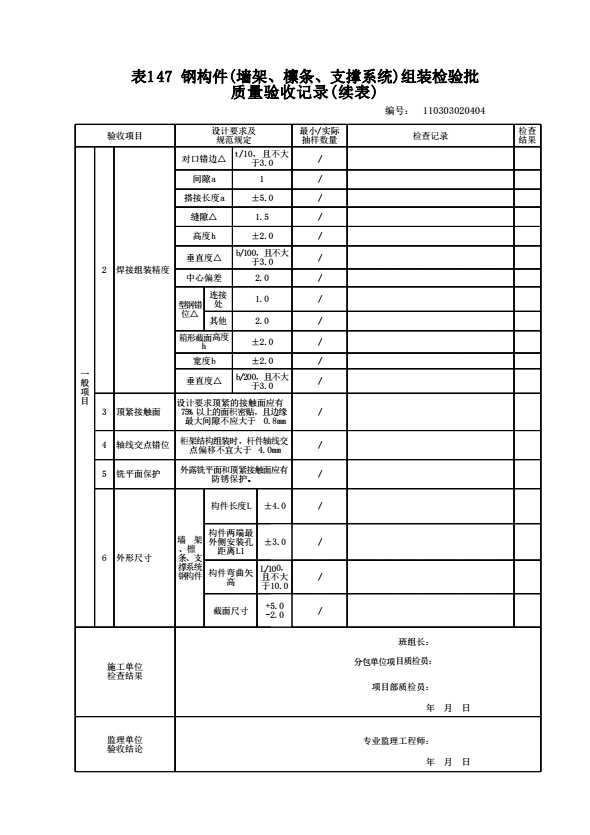 表格名称:110303020404 钢构件(墙架、檩条、支撑系统)组装检验批质量验收记录