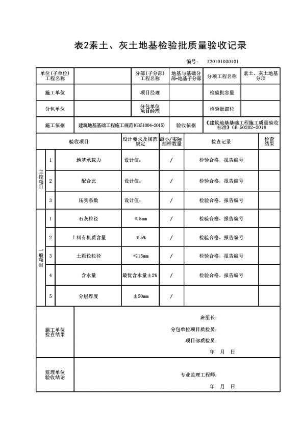 表格名称:120101030101 素土、灰土地基检验批质量验收记录