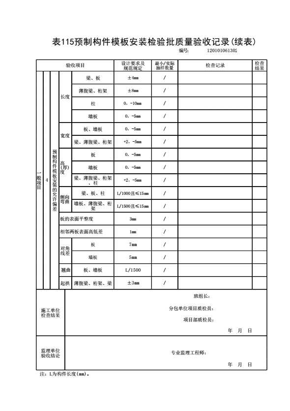 表格名称:120101061302 预制构件模板安装检验批质量验收记录