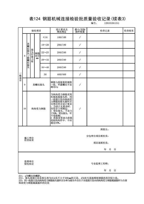 表格名称:120101061312 钢筋机械连接检验批质量验收记录