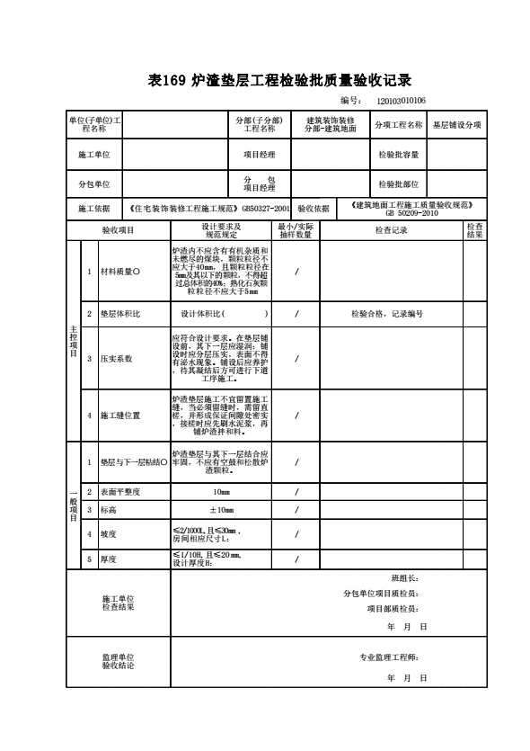 表格名称:120103010106 炉渣垫层工程检验批质量验收记录