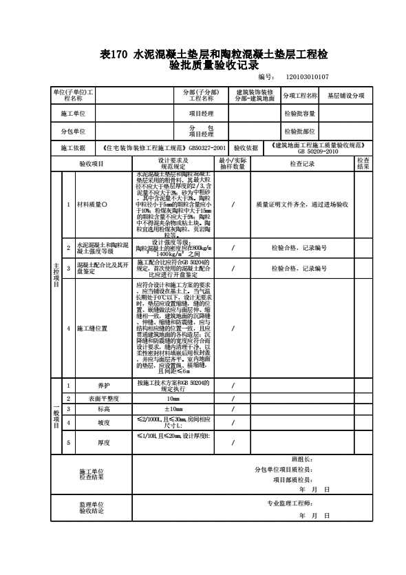 表格名称:120103010107 水泥混凝土垫层和陶粒混凝土垫层工程检验批质量验收记录