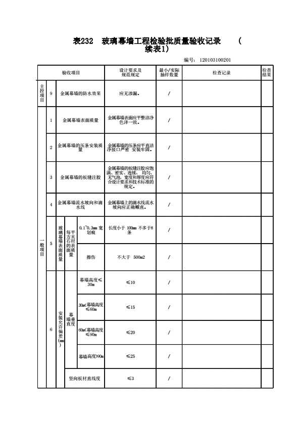表格名称:120103100201 金属幕墙工程检验批质量验收记录