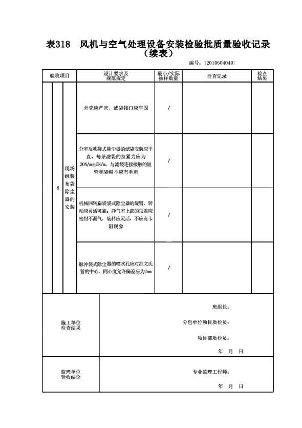 表格名称:120106040401 风机与空气处理设备安装检验批质量验收记录