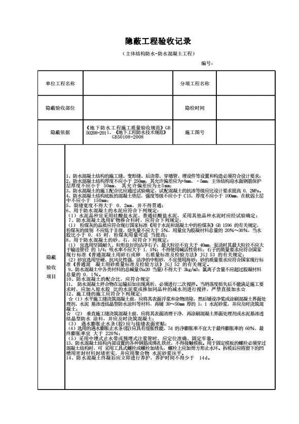 表格名称:隐蔽工程验收记录(主体结构防水-防水混凝土工程)