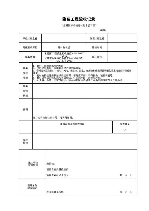 表格名称:隐蔽工程验收记录(金属围护系统卷材防水层工程)