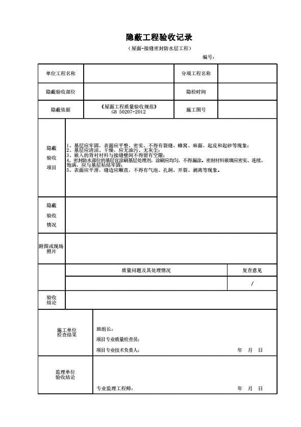 表格名称:隐蔽工程验收记录(屋面-接缝密封防水层工程)
