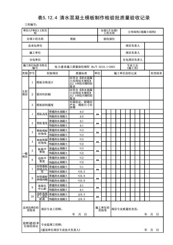表格名称:表5.12.4 清水混凝土模板制作检验批质量验收记录