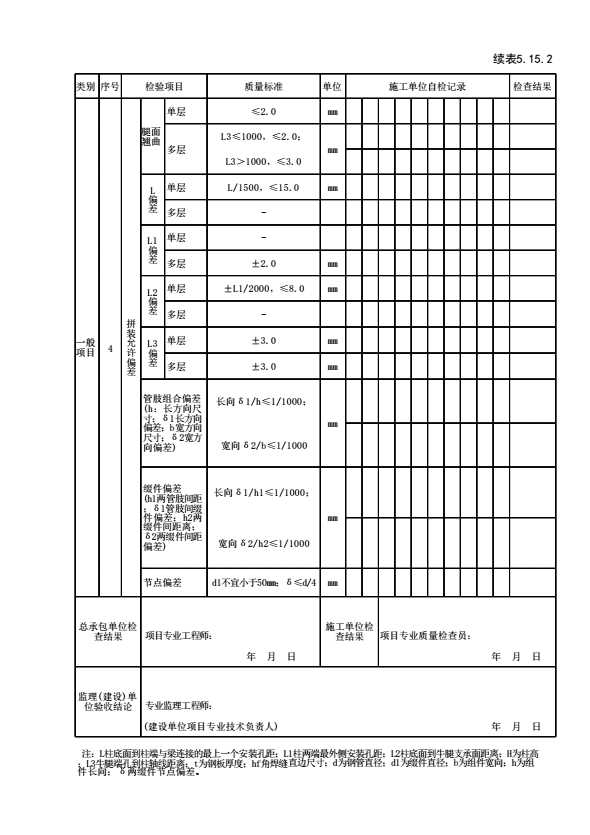 表格名称:表5.15.2 钢管混凝土构件现场拼装工程检验批质量验收记录