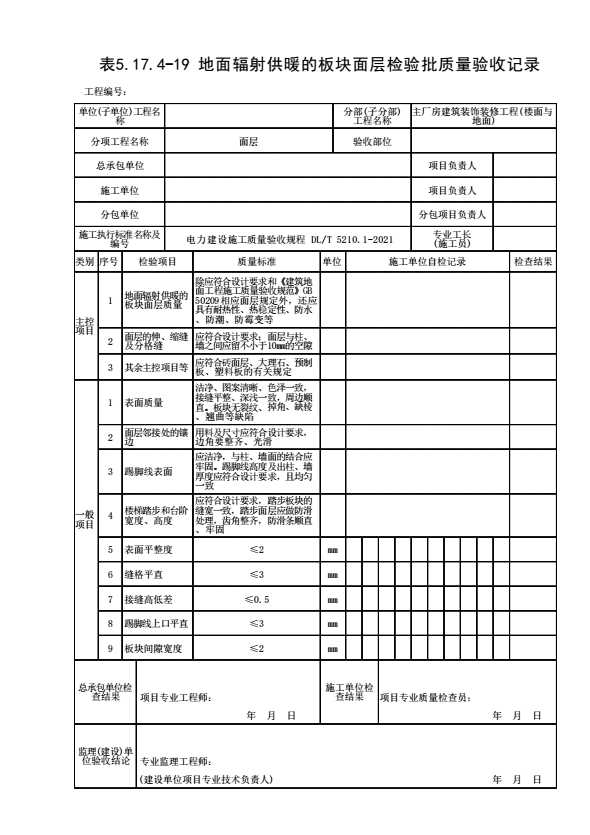 表格名称:表5.17.4-19 地面辐射供暖的板块面层检验批质量验收记录