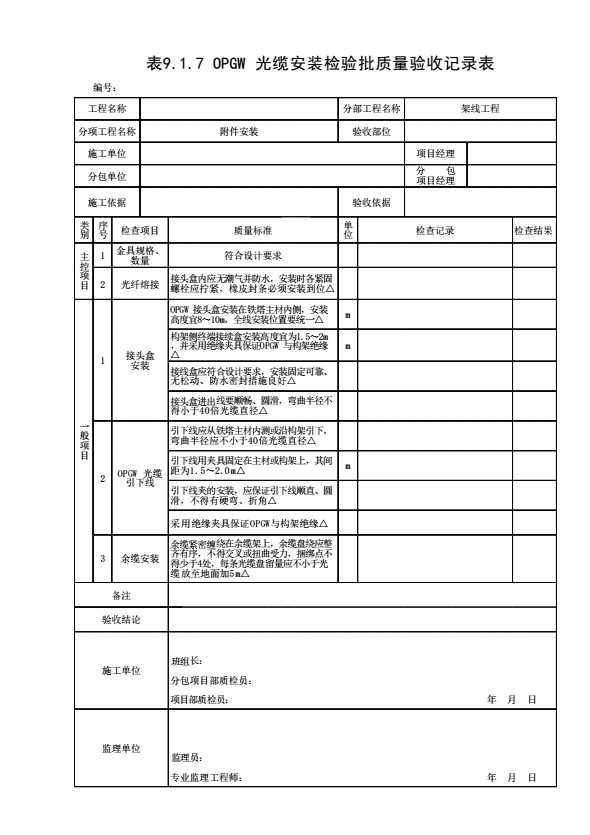 表9.1.7 0PGW光缆安装检验批质量验收记录表
