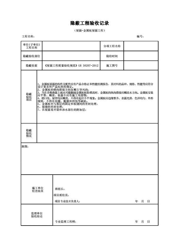 表格名称:隐蔽工程验收记录(屋面-金属板屋面工程)