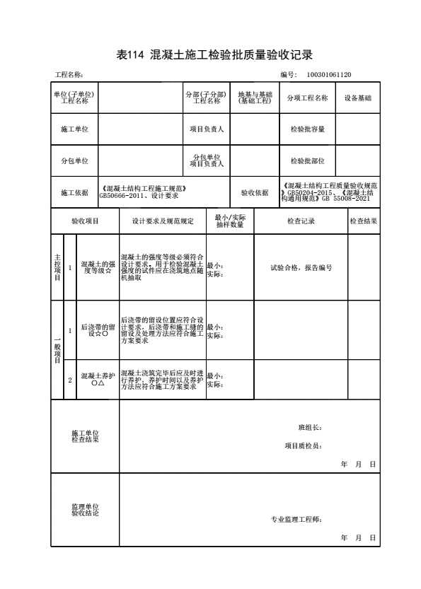 表格名称:100301061120 混凝土施工检验批质量验收记录