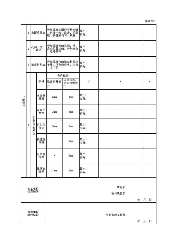 表格名称:110103070204 骨架隔墙工程检验批质量验收记录