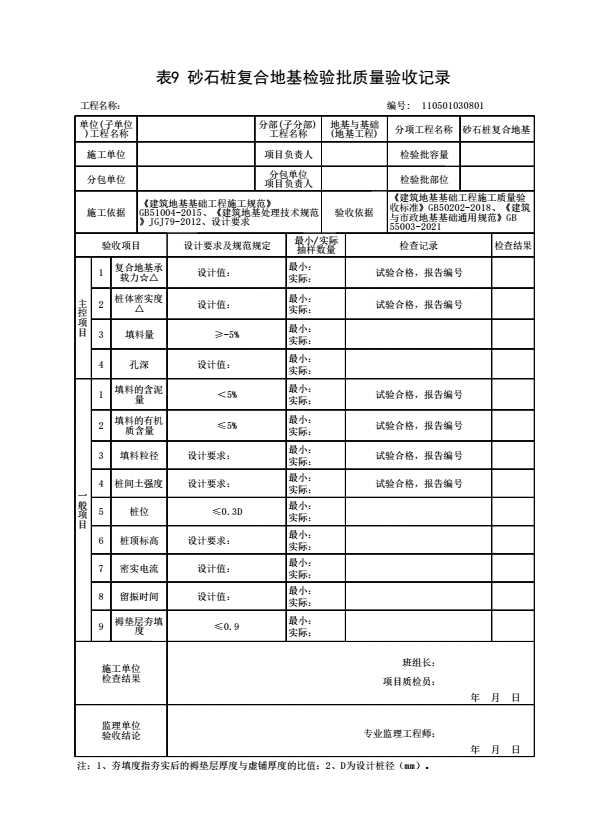 表格名称:110501030801 砂石桩复合地基检验批质量验收记录