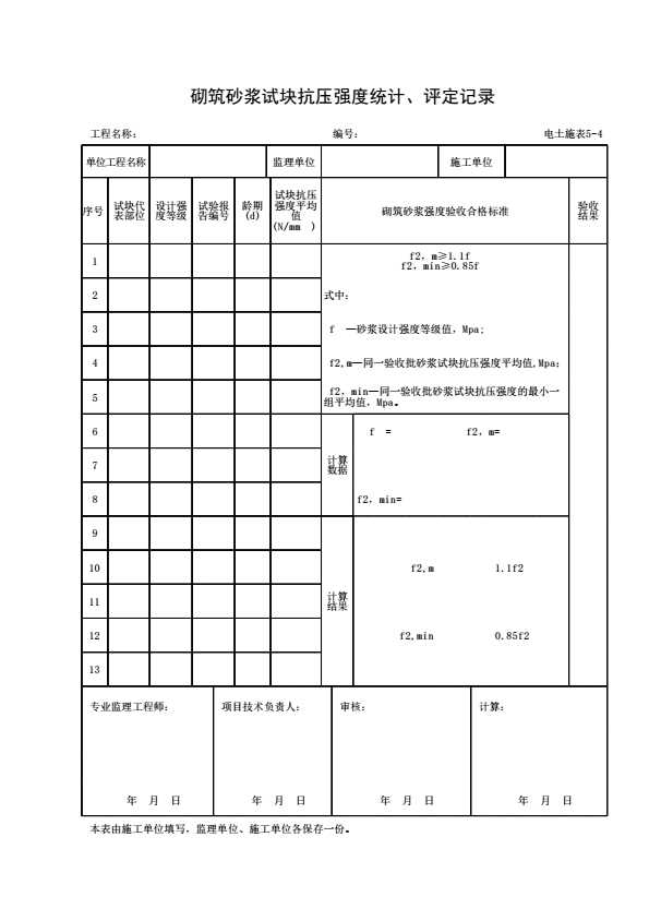 表格名称:电土施表5-4 砌筑砂浆试块抗压强度统计、评定记录(≥3组)