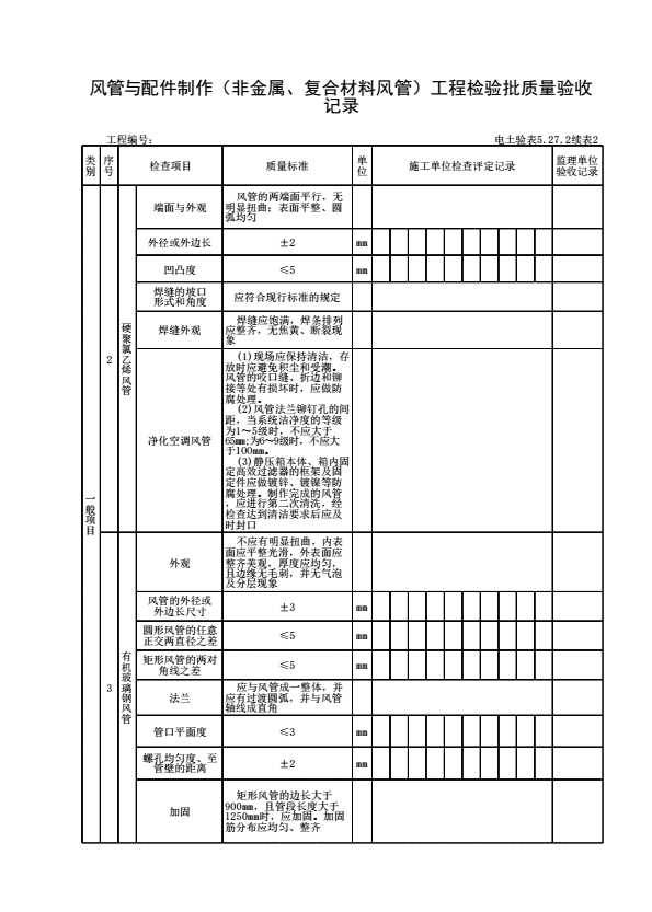 表格名称:电土验表5.27.2 风管与配件制作(非金属、复合材料风管)工程检验批质量验收记录