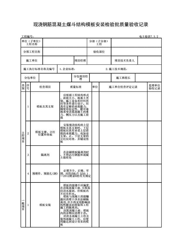 表格名称:电土验表7.3.2 现浇钢筋混凝土煤斗结构模板安装检验批质量验收记录