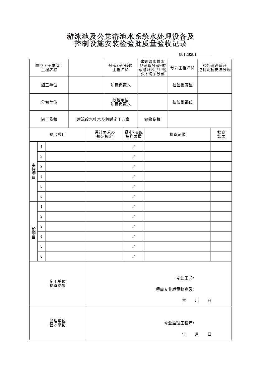 表格名称:05110201_游泳池及公共浴池水系统水处理设备及控制设施安装检验批质量验收记录
