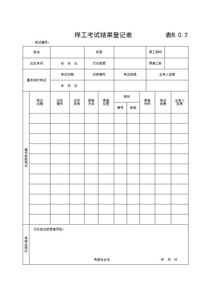 表格名称:焊工考试结果登记表
