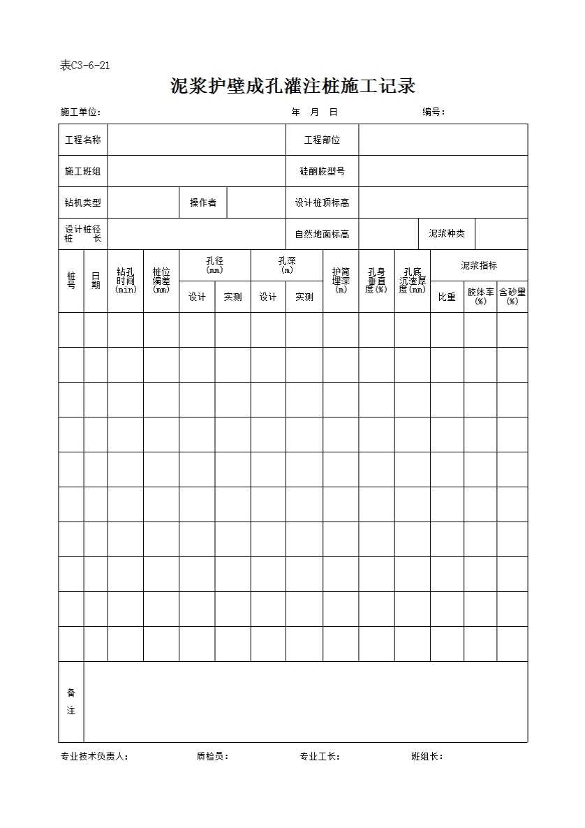 表格名称:198.泥浆护壁成孔灌注桩施工记录(C3-6-21)