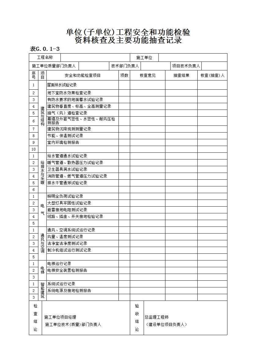 表格名称:单位(子单位)工程安全和功能检验资料核查及主要功能抽查记录(G.0.1-3)