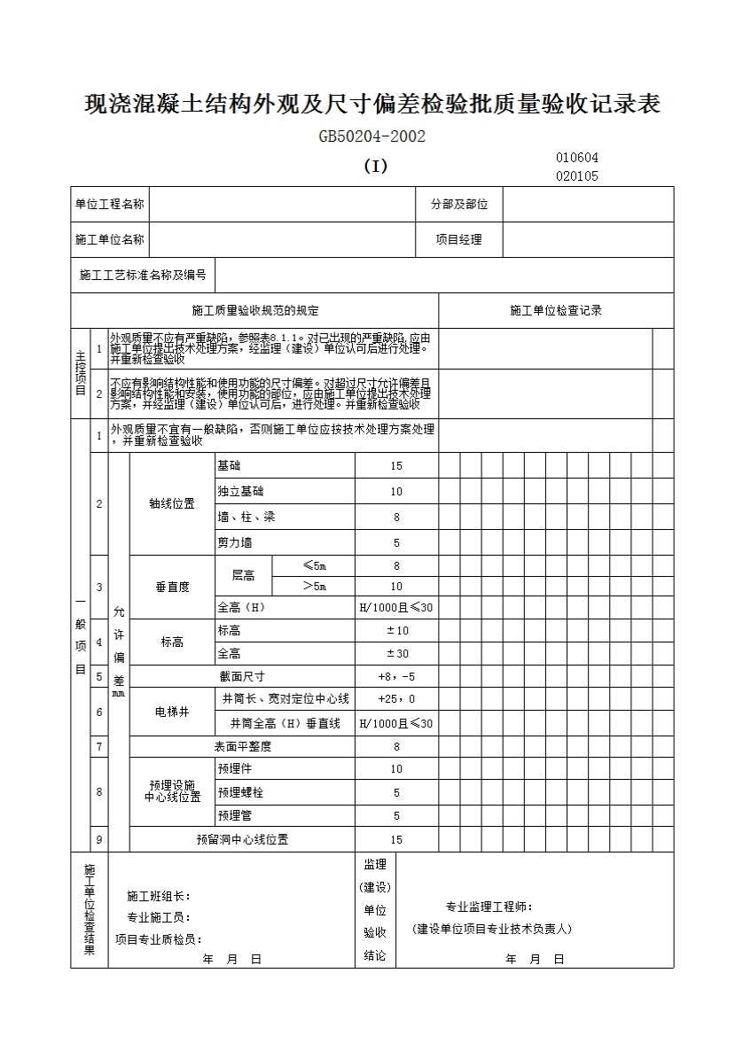 表格名称:现浇混凝土结构外观及尺寸偏差检验批质量验收记录表010604