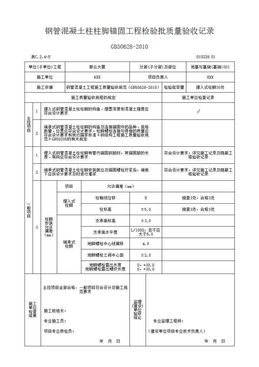钢管混凝土柱柱脚锚固检验批质量验收记录