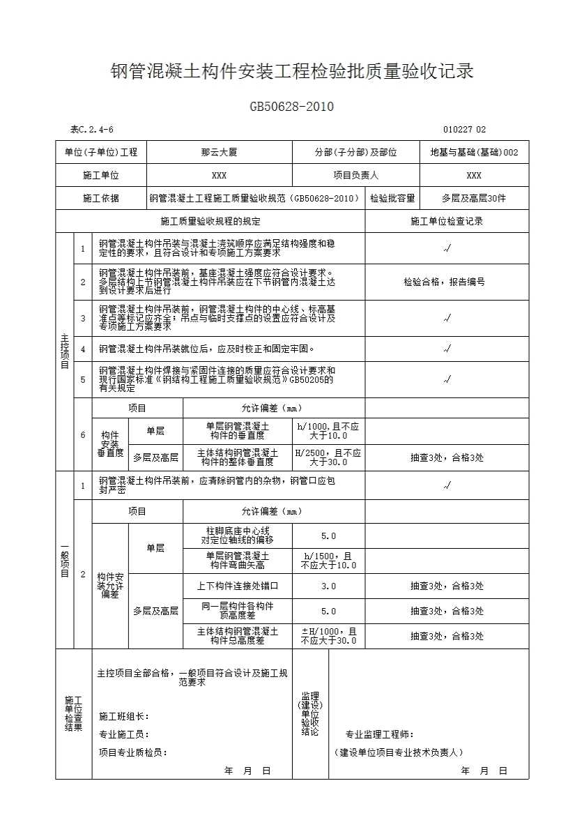 010227 钢管混凝土构件安装工程检验批质量验收记录