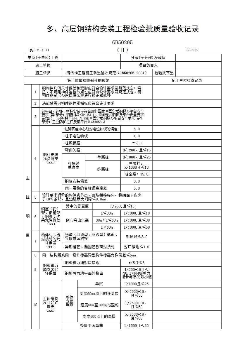020306 多、高层钢结构安装工程检验批质量验收记录(Ⅱ)