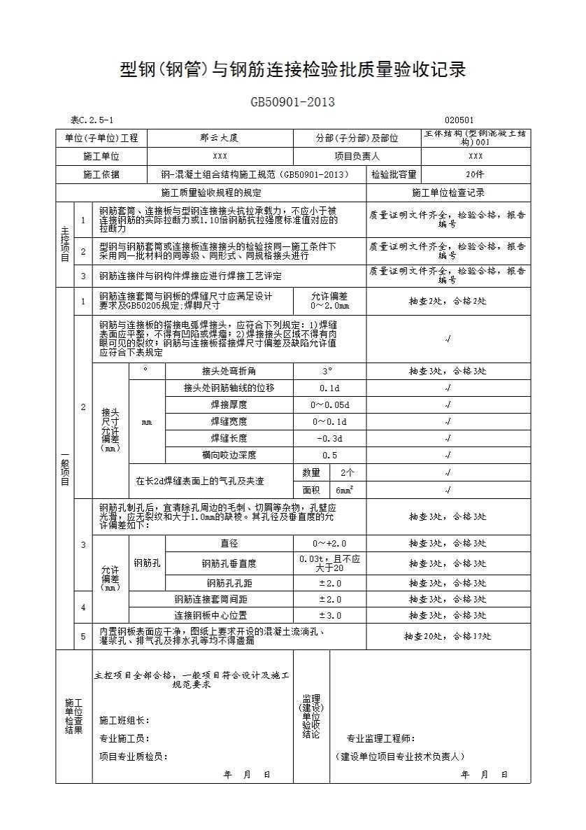 检查方法:试件制作和检验方法按《钢-混凝土组合结构施工规范》GB50901-2013附录B,钢筋套筒连接抗拉强度检验试验方法进行,检验实验和评定。
