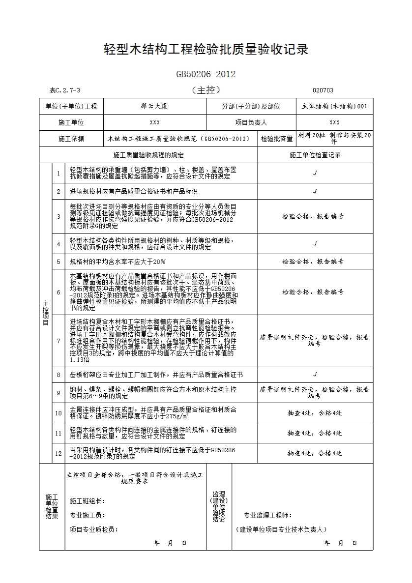 轻型木结构材料、构配件的质量控制应以同一建设项目同期施工的每幢建筑面积不超过300㎡、总建筑面积不超过3000㎡的轻型木结构建筑为一个检验批,不足3000㎡者应视为一个检验批,单位建筑棉结超过300㎡时,应单独视为一个检验批,轻型木结构制作安装质量控制应以一幢房屋的一层为一个检验批。