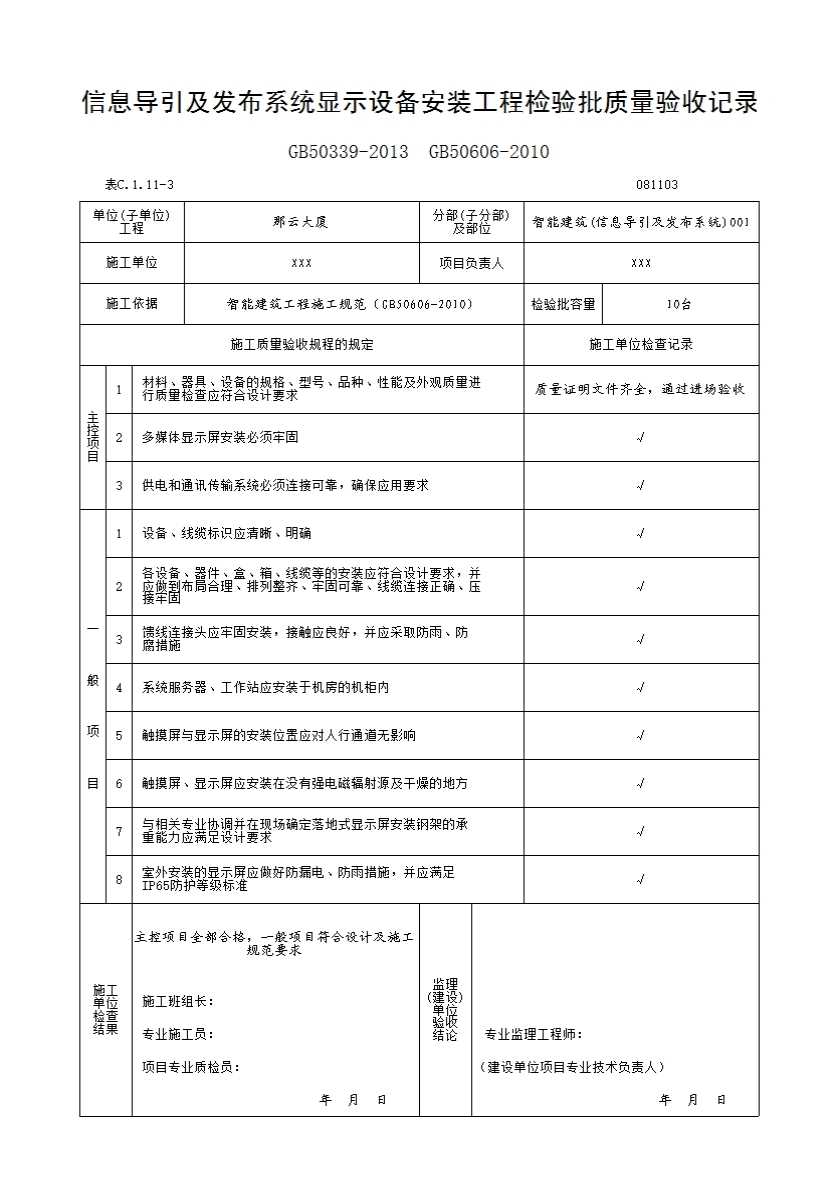 081103 信息导引及发布系统显示设备安装工程检验批质量验收记录