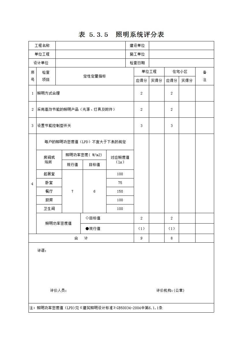 表格名称:表5.3.5 照明系统评分表