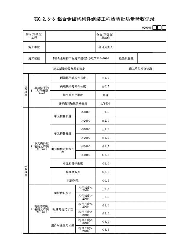 表格名称:020605 铝合金结构构件组装工程检验批质量验收记录