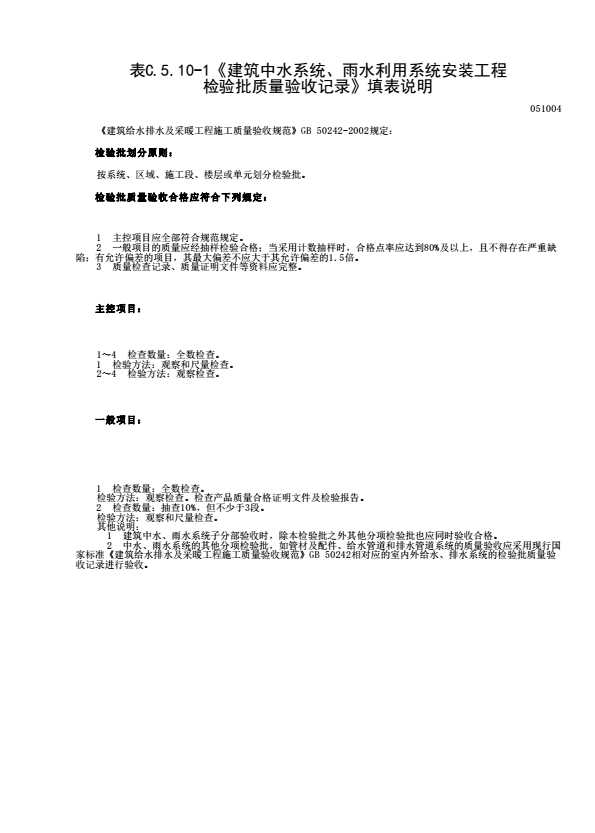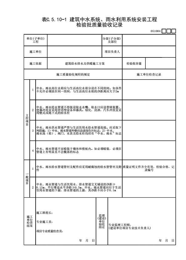 表格名称:051004 建筑中水系统、雨水利用系统安装工程检验批质量验收记录
