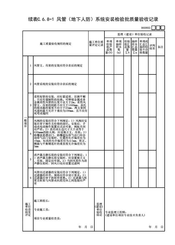 表格名称:060803 风管(地下人防)系统安装检验批质量验收记录