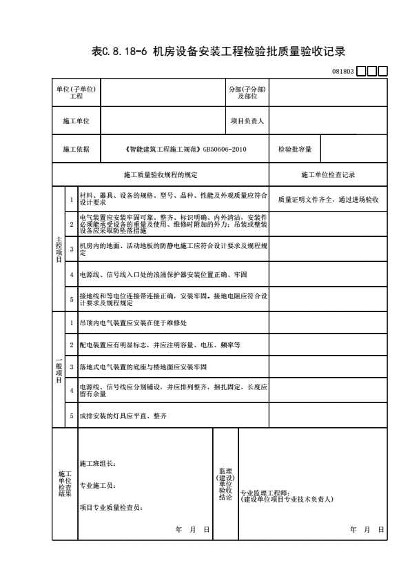 表格名称:081803 机房设备安装工程检验批质量验收记录