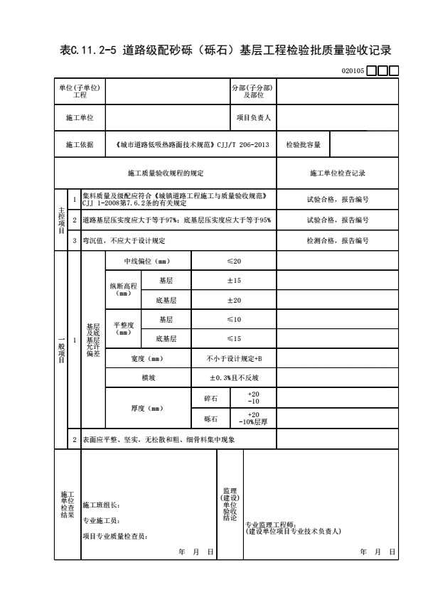 表格名称:020105 道路级配砂砾(砾石)基层工程检验批质量验收记录