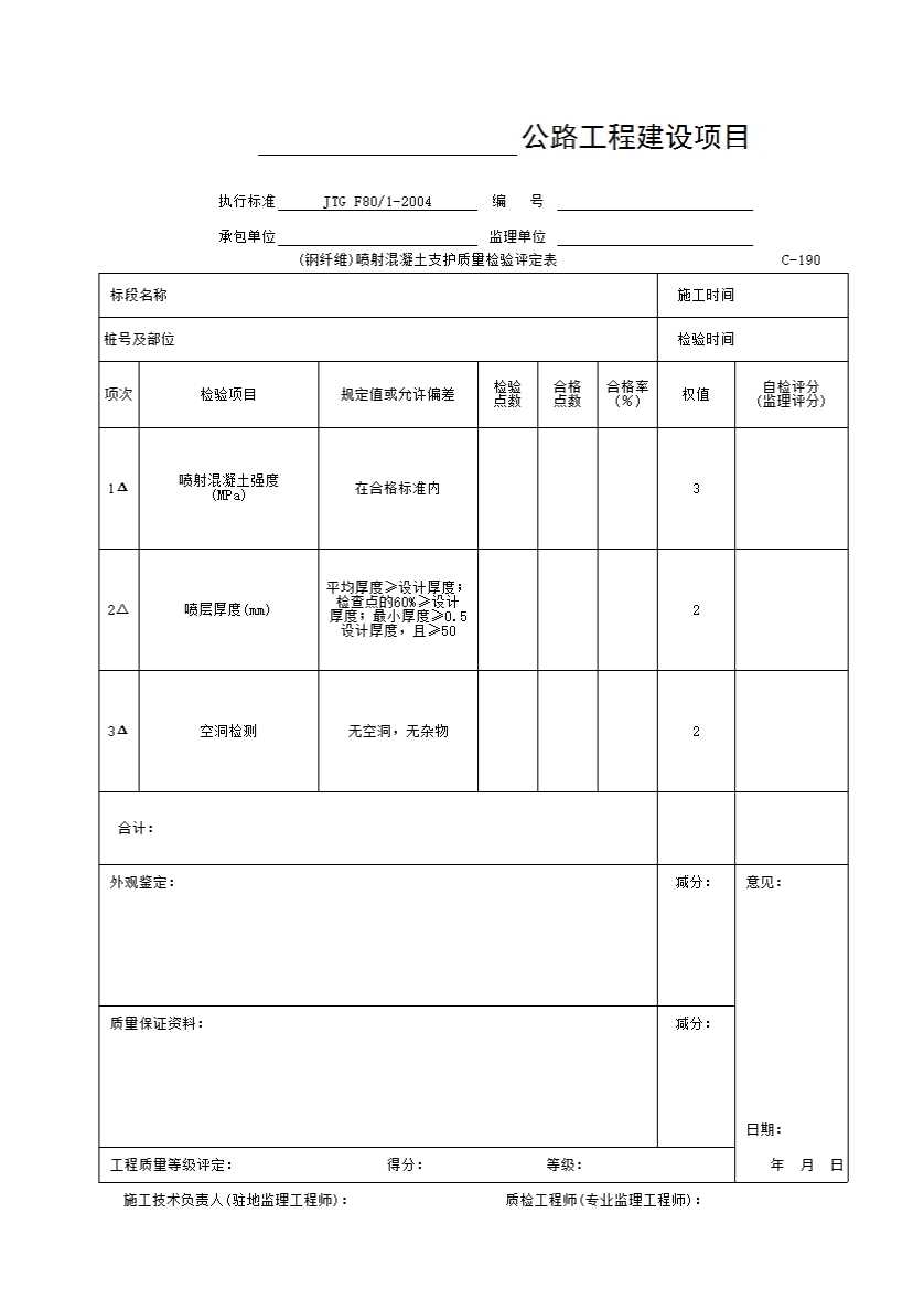 表格名称:C-190表 (钢纤维)喷射混凝土支护质量检验评定表