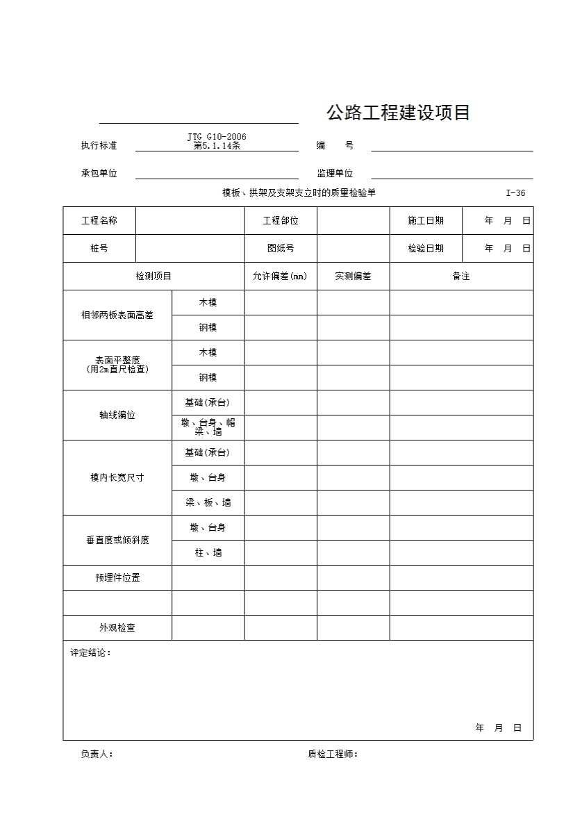 表格名称:I-36表 模板、拱架及支架支立时的质量检验单